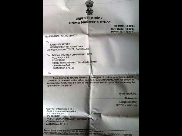 ಈ ಕುರಿತಂತೆ ರೈತರು ಜೂನ್ ತಿಂಗಳಲ್ಲಿ ಪ್ರಧಾನಮಂತ್ರಿ ಕಚೇರಿಗೆ ಪತ್ರ ಬರೆದು ಬೆಳೆ ಪರಿಹಾರ ನೀಡುವಂತೆ ಒತ್ತಾಯಿಸಿದ್ದರು. ರೈತರ ಪತ್ರಕ್ಕೆ ಸ್ಪಂದಿಸಿದ ಪ್ರಧಾನಮಂತ್ರಿ ಕಚೇರಿಯ ಸಿಬ್ಬಂದಿ 26.07.2017 ರಂದು ರಾಜ್ಯ ಸರ್ಕಾರದ ಮುಖ್ಯ ಕಾರ್ಯದರ್ಶಿ ಹಾಗೂ ಚಾಮರಾಜನಗರ ಜಿಲ್ಲಾಧಿಕಾರಿಗಳಿಗೆ ಪತ್ರ ಬರೆದು ರೈತರ ಅರ್ಜಿಯನ್ನು ಪರಿಶೀಲಿಸಿ ಕ್ರಮಕೈಗೊಳ್ಳುವಂತೆ ಸೂಚಿಸಿದ್ದರು.