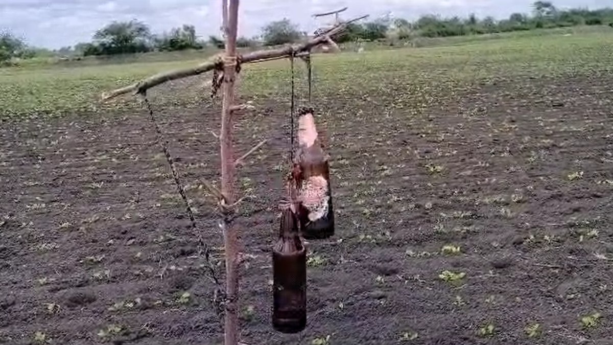 ರಸ್ತೆ ಬದಿ ಬಳಸಿ ಬಿಸಾಡಿದ ಬಿಯರ್ ಬಾಟಲಿ ಆಯ್ದು ತಂದು ಕಟ್ಟಿಗೆಗೆ ನೇತು ಹಾಕಿ ಅವುಗಳ ಶಬ್ಧದಿಂದ ಶೇಂಗಾ, ಹೆಸರು, ಉದ್ದು, ಸೋಯಾಬಿನ್ ಬೆಳೆಯಗಳನ್ನು ಉಳಿಸಿಕೊಳ್ಳಲು ರೈತರು ಹರಸಾಹಸ ಪಡುತ್ತಿದ್ದಾರೆ. ನಿತ್ಯ ಚಿಗುರಿಗಳ ಕಾಟದಿಂದ ಕಾಯುತ್ತಾ ಬೆಳೆ ಉಳಿಸಿಕೊಳ್ಳಲು ರೈತರು ಹರಸಾಹಸ ಪಡುವಂತಹ ಪರಿಸ್ಥಿತಿ ಇದೆ.