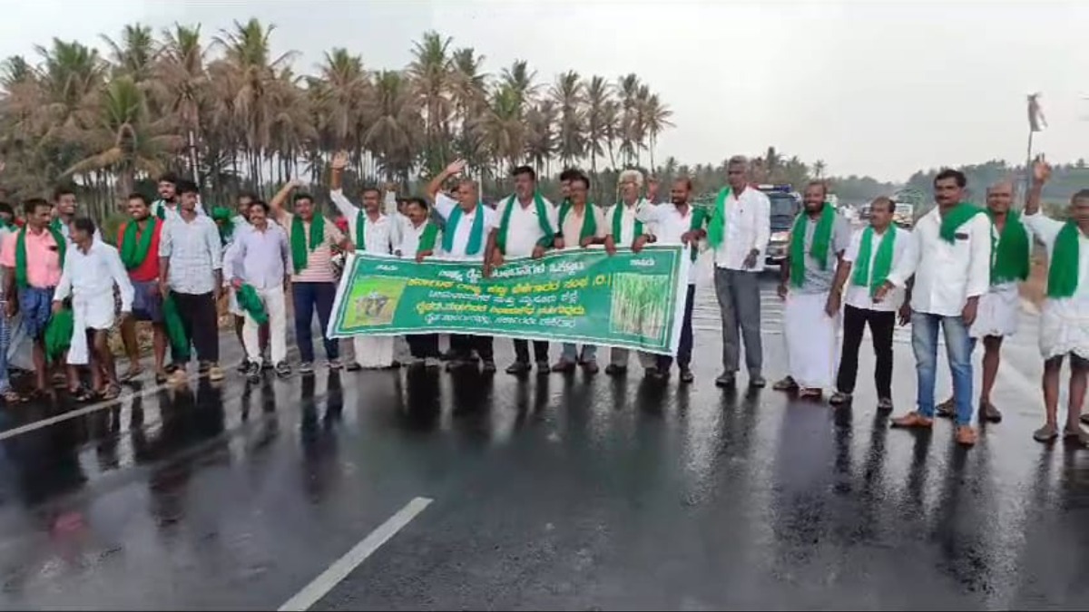 ಮಳೆ ನಡುವೆಯೇ ಬೆಂಗಳೂರು-ದಿಂಡಿಗಲ್ ರಾಷ್ಟ್ರೀಯ ಹೆದ್ದಾರಿ ತಡೆದು ರೈತರ ಪ್ರತಿಭಟನೆ
