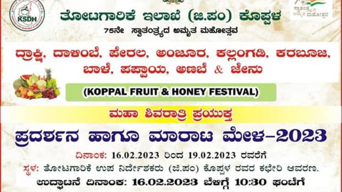 ದ್ರಾಕ್ಷಿ, ದಾಳಿಂಬೆ, ಪೇರಲ, ಅಂಜೂರ, ಕಲ್ಲಂಗಡಿ, ಕರಬೂಜ, ಬಾಳೆ, ಪಪ್ಪಾಯ, ಅಣಬೆ ಹಾಗೂ ಜೇನು ಪ್ರದರ್ಶನ ಮತ್ತು ಮಾರಾಟ ಮೇಳವನ್ನು ಕೊಪ್ಪಳದಲ್ಲಿ ಆಯೋಜನೆ ಮಾಡಲಾಗಿದೆ.