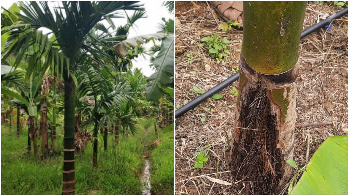 ಅಡಿಕೆಯಲ್ಲಿ ಬೇಸಿಗೆ ಬಿಸಿಲು ಹೆಚ್ಚಾದಂತೆ ಅಡಿಕೆ ಮರದ ಕಾಂಡಗಳು ಬೆಂದು ಹೋಗುತ್ತವೆ, ಒಣಗಿ ಟೊಳ್ಳಾದಂತೆ ಕಾಣುತ್ತವೆ. ಇದನ್ನು ತಪ್ಪಿಸದಿದ್ದರೆ ಅಡಿಕೆ ಮರಗಳು ಹೆಚ್ಚಿನ ಕಾಲ ಬದುಕುವುದಿಲ್ಲ.