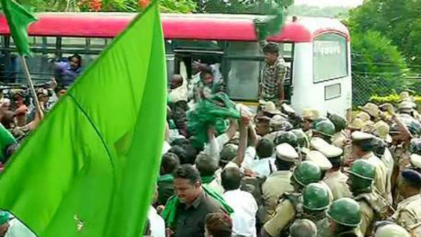 ರೈತ ಮುಖಂಡ ದರ್ಶನ್ ಪುಟ್ಟಣ್ಣಯ್ಯ ನೇತೃತ್ವದಲ್ಲಿ ಪ್ರತಿಭಟನೆ ನಡೆಯುತ್ತಿದ್ದು, ಅವರನ್ನು ಬಂಧಿಸಲಾಗಿದೆ. ಇನ್ನುಳಿದ ರೈತರನ್ನು ಸುಮಾರು ಐದು ಬಸ್ ಗಳಲ್ಲಿ ಬೇರೆಡೆಗೆ ಸ್ಥಳಾಂತರಿಸಿದ್ದಾರೆ.