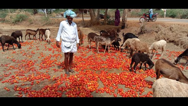 ಸೂಕ್ತ ಬೆಲೆ ಸಿಗದೇ, ಮಾರುಕಟ್ಟೆಗೆ ತಲುಪಿಸಲೂ ಆಗದೇ ಟೊಮೆಟೊ ಬೆಳೆಯನ್ನು ಕಿತ್ತು ರಾಶಿ ಹಾಕಿರುವ ಈರಣ್ಣ ತಲೆಯ ಮೇಲೆ ಕೈ ಹೊತ್ತು ಕುಳಿತಿದ್ದಾನೆ. ಬೆಳೆ ಕೈಗೆಟುಕದೆ ಬೇಸತ್ತ ಈ ರೈತ ಪ್ರತಿನಿತ್ಯ ನೂರಾರು ಎಮ್ಮೆ, ಕುರಿಗಳನ್ನು ಬಿಟ್ಟು ಬೆಳೆಯನ್ನೇ ಮೇಯಿಸುತ್ತಿದ್ದಾನೆ.