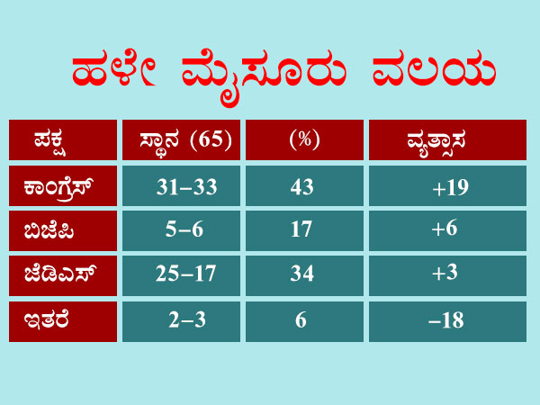 ಸಿದ್ದರಾಮಯ್ಯ ಅವರ ವರ್ಚಸ್ಸು ಮತ್ತು ಕಳೆಗುಂದುತ್ತಿರುವ ಜೆಡಿಎಸ್ ಪರ ಒಲವಿನಿಂದಾಗಿ ಕಾಂಗ್ರೆಸ್ 31-33 ಸ್ಥಾನಗಳು, ಬಿಜೆಪಿ 5-6 ಸ್ಥಾನ ಮತ್ತು ಜೆಡಿಎಸ್ 25-27 ಮತ್ತು ಜೆಡಿಎಸ್ 5-6 ಸೀಟುಗಳನ್ನು ಕಬಳಿಸಲಿವೆ. ಉಳಿದಂತೆ, ಇತರರು ಅಥವಾ ಪಕ್ಷೇತರ ಅಭ್ಯರ್ಥಿಗಳ ಬಗ್ಗೆ ಹಳೆ ಮೈಸೂರು ಪ್ರಾಂತ್ಯದಲ್ಲಿ ಜನರಿಗೆ ಹೆಚ್ಚಿನ ಒಲವಿದ್ದಂತಿಲ್ಲ. ಇತರರು ಕೇವಲ 2-3 ಸೀಟುಗಳನ್ನು ಮಾತ್ರ ಗೆಲ್ಲಲು ಶಕ್ತರಾಗಲಿದ್ದಾರೆ. ಇದಕ್ಕೆ ಮೈಸೂರು ಪ್ರಾಂತ್ಯದ ಕೆಲ ಧೀಮಂತ ನಾಯಕರು ಪಕ್ಷಾಂತರ ಮಾಡಿ ಪಕ್ಷಕ್ಕೆ ದ್ರೋಹ ಬಗೆದದ್ದೂ ಇರಬಹುದು.