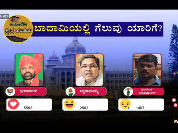 ಕರ್ನಾಟಕ ವಿಧಾನಸಭಾ ಚುನಾವಣೆಗಾಗಿ ಸಾಮಾಜಿಕ ಜಾಲ ತಾಣಗಳಲ್ಲಿ ಓದುಗರ ಅಭಿಪ್ರಾಯ ಸಂಗ್ರಹ ಮಾಡುವ ಉದ್ದೇಶದಿಂದ ಒನ್ಇಂಡಿಯಾ ತನ್ನ ಫೇಸ್ ಬುಕ್ ಪುಟದಲ್ಲಿ ಫೇಸ್ಬುಕ್ ಲೈವ್ ಪೋಲ್ ನಡೆಸುತ್ತಿದೆ. ಪ್ರತಿಷ್ಠಿತ ಬಾದಾಮಿ ವಿಧಾನಸಭಾ ಕ್ಷೇತ್ರಕ್ಕಾಗಿ ನಡೆಸಿದ ಸಮೀಕ್ಷೆ ಫಲಿತಾಂಶ ಇಲ್ಲಿದೆ.
