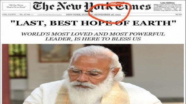 ದಿ ನ್ಯೂಯಾರ್ಕ್ ಟೈಮ್ಸ್ ಸೆಪ್ಟೆಂಬರ್ 26 ರಂದು ತನ್ನ ಮುಖಪುಟದಲ್ಲಿ ಪ್ರಧಾನ ಮಂತ್ರಿ ನರೇಂದ್ರ ಮೋದಿ "ಭೂಮಿಯ ಕೊನೆಯ ಉತ್ತಮ ಭರವಸೆ" ಎಂದು ಶೀರ್ಷಿಕೆ ನೀಡಿ ನರೇಂದ್ರ ಮೋದಿಯ ದೊಡ್ಡ ಫೋಟೋ ಸಹಿತ ವರದಿ ಮಾಡಿದೆ ಎಂದು ಫೋಟೋವೊಂದು ವೈರಲ್ ಆಗಿದೆ. ಈ ಫೋಟೋವನ್ನು ಅದೇಷ್ಟೋ ಮಂದಿ ನರೇಂದ್ರ ಮೋದಿ ಬೆಂಬಲಿಗರು ಪೋಸ್ಟ್ ಮಾಡಿದ್ದಾರೆ.
