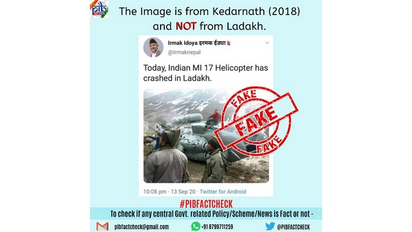Claim:A viral tweet claims that an @IAF_MCC's MI-17 Helicopter has crashed in Ladakh.#PIBFactCheck:The claim is #Fake. The wreckage exhibited is of a helicopter crash that happened in 2018 near Kedarnath, Uttarakhand. No such incident has taken place recently anywhere in #Ladakh pic.twitter.com/ICXX8zO9ZO