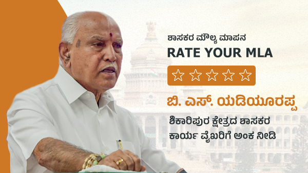 ಈ ಪುಟದಲ್ಲಿ ನೀವು ಶಿಕಾರಿಪುರ ಕ್ಷೇತ್ರದ ಬಿಜೆಪಿ ಶಾಸಕ ಬಿ. ಎಸ್. ಯಡಿಯೂರಪ್ಪಗೆ ವೋಟ್ ಮಾಡಬಹುದಾಗಿದೆ. ಪುಟದ ಕೊನೆಯಲ್ಲಿ ನೀವು ಎಷ್ಟು ಅಂಕ ನೀಡಿದ್ದೀರಿ? ಎಂಬ ಸರಾಸರಿ ತೋರಿಸುತ್ತದೆ.