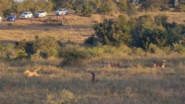 ದಕ್ಷಿಣ ಆಫ್ರಿಕಾದ ಕ್ರುಗರ್ ರಾಷ್ಟ್ರೀಯ ಉದ್ಯಾನವನದಿಂದ ವಿಡಿಯೋವೊಂದು ವೈರಲ್ ಆಗಿದೆ. ಉದ್ಯಾನವನದಲ್ಲಿ 20 ಮಾರ್ಚ್ 2022 ರಂದು ಕೆಲವರು ಈ ವಿಡಿಯೋವನ್ನು ಚಿತ್ರೀಕರಿಸಿದ್ದಾರೆ. ಆದರೆ ಅದು ಈಗ ಹೆಚ್ಚು ವೈರಲ್ ಆಗುತ್ತಿದೆ. ವಿಶೇಷ ವಾಹನಗಳಲ್ಲಿ ಹಲವಾರು ಪ್ರವಾಸಿಗರು ರಾಷ್ಟ್ರೀಯ ಉದ್ಯಾನವನಕ್ಕೆ ಆಗಮಿಸಿದ್ದು, ಜಿಂಕೆಗಳು ಅವುಗಳ ನಡುವೆ ಸ್ವಚ್ಛಂದವಾಗಿ ವಿಹರಿಸುತ್ತಿರುವುದನ್ನು ವಿಡಿಯೋದಲ್ಲಿ ಕಾಣಬಹುದು. ಆಗ ಅಲ್ಲಿನ ಪೊದೆಗಳ ನಡುವೆ ಚಿರತೆಯೊಂದು ಹೊರಹೊಮ್ಮುತ್ತದೆ. ಆಹಾರವನ್ನು ಹುಡುಕಿಕೊಂಡು ಬಂದ ಚಿರತೆ ಜಿಂಕೆಗಳ ಹಿಂಡಿನ ಮೇಲೆ ದಾಳಿ ಮಾಡಿದೆ.
