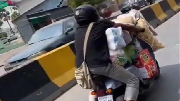 ಯುವಕ ತನ್ನ ಸ್ಕೂಟರ್ನಲ್ಲಿ ಒಂದೇ ಬಾರಿಗೆ ಅಧಿಕ ಸರಕುಗಳನ್ನು ವರ್ಗಾಯಿಸಲು ಪ್ರಯತ್ನಿಸುತ್ತಿದ್ದನು. ಅವನ ಮುಂದೆ ಒಂದು ಟನ್ ಸಾಮಾನುಗಳನ್ನು ಕಟ್ಟಿ ಜೋಡಿಸಿದ್ದನು.