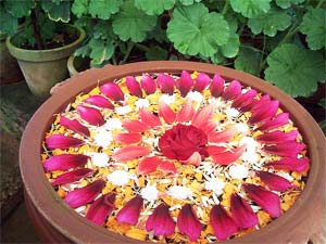 1. ಹೂವಿನ ರಂಗೋಲಿ: ಹೂವಿನ ದಳಗಳು, ಅದರಲ್ಲೂ ಹಳದಿ ಸೇವಂತಿಗೆ ಹೂವು ಮತ್ತು ಗುಲಾಬಿ ದಳಗಳು ರಂಗೋಲಿ ಅಲಂಕಾರಕ್ಕೆ ಚೆಂದ. ರಂಗೋಲಿಯ ಒಳಗೆ ಮಾತ್ರವಲ್ಲದೆ, ಅದನ್ನು ಹೊರಗಿನ ಗೆರೆಯ ಸುತ್ತಲೂ ಅಲಂಕರಿಸಬಹುದು. ರಂಗೋಲಿಯ ಒಳಗೆ ಖಾಲಿ ಜಾಗ ಬಿಡದೆ ವಿವಿಧ ಹೂವಿನ ದಳಗಳಿಂದ ತುಂಬಿಸಿದರೆ ರಂಗೋಲಿಗೆ ಇನ್ನಷ್ಟು ಮೆರುಗು. ರಂಗೋಲಿಯಲ್ಲಿ ಸುವಾಸನೆ ಕೂಡ ಬರಬೇಕು ಎಂದಾದರೆ ವಾಟರ್ ಸೆಂಟ್ ಕೂಡ ಬಳಸಬಹುದು.