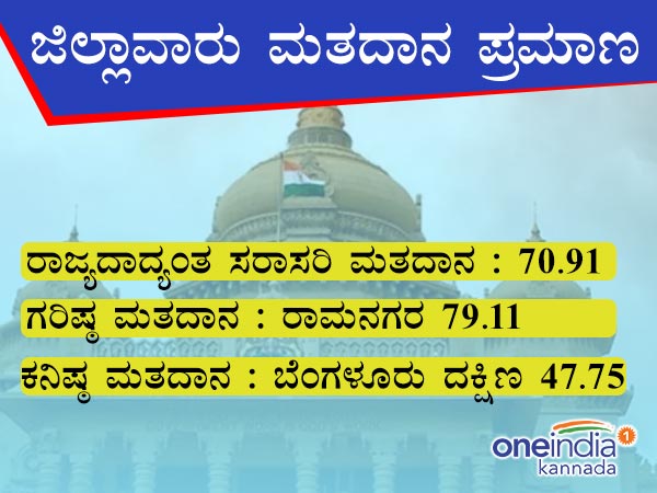 ರಾಮನಗರ ಜಿಲ್ಲೆಯಲ್ಲಿ ರಾಜ್ಯದಲ್ಲೇ ಅತೀ ಹೆಚ್ಚಿನ ಮತದಾನವಾಗಿದೆ. ಇಲ್ಲಿ ಶೇಕಡಾ 79.11 ಜನರು ಮತ ಚಲಾಯಿಸಿದ್ದಾರೆ.