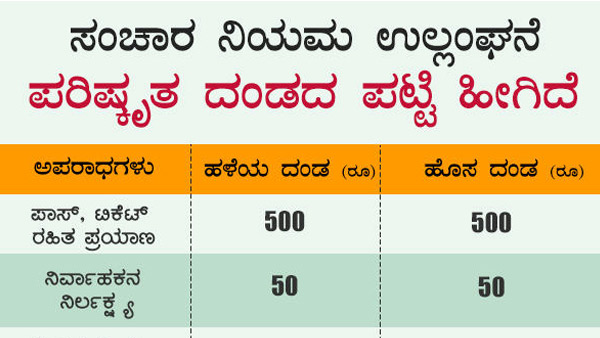 ಟಿಕೆಟ್ ಇಲ್ಲದೆ ಪ್ರಯಾಣಕ್ಕೆ 500 ರೂ. ವಿಧಿಸಲಾಗುತ್ತದೆ. ವಾಹನಗಳ ಮಾಹಿತಿ ನೀಡದೆ ಇದ್ದರೆ ವಿಧಿಸಲಾಗುವ ದಂಡವನ್ನು 1,000ಕ್ಕೆ ಇಳಿಸಲಾಗಿದೆ.