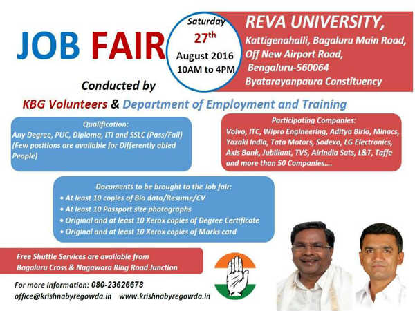 ಬಾಗಲೂರು ಮುಖ್ಯರಸ್ತೆಯಲ್ಲಿರುವ ರೇವಾ ಯೂನಿರ್ವಸಿಟಿಯಲ್ಲಿ ಆಗಸ್ಟ್ 27ರ ಶನಿವಾರ ಬೆಳಗ್ಗೆ 10 ರಿಂದ ಸಂಜೆ 4 ಗಂಟೆಯ ತನಕ ಉದ್ಯೋಗ ಮೇಳ ನಡೆಯಲಿದೆ. ಬಾಗಲೂರು ಕ್ರಾಸ್ ಮತ್ತು ನಾಗವಾರ ರಿಂಗ್ ರಸ್ತೆಯಿಂದ ಯೂನಿರ್ವಸಿಟಿಗೆ ಬಸ್ ಸೌಲಭ್ಯವನ್ನು ಕಲ್ಪಿಸಲಾಗಿದೆ.