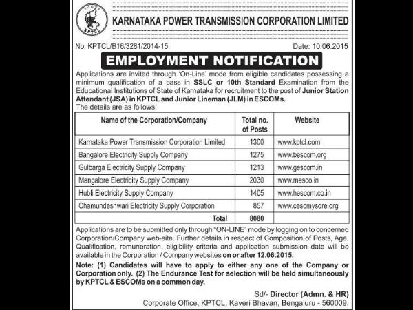 ಕರ್ನಾಟಕ ವಿದ್ಯುತ್ ಪ್ರಸರಣ ನಿಗಮ ನಿಯಮಿತದಲ್ಲಿ ಜ್ಯೂನಿಯರ್ ಸ್ಟೇಷನ್ ಅಸಿಸ್ಟೆಂಟ್ಸ್, ಜ್ಯೂನಿಯರ್ ಲೈನ್ ಮ್ಯಾನ್ ಹುದ್ದೆಗಳಿಗೆ ನೇಮಕಾತಿ ಮಾಡಿಕೊಳ್ಳಲಾಗುತ್ತದೆ. ಲೈನ್ ಮ್ಯಾನ್ ಹುದ್ದೆಗೆ ಎಸ್ಎಸ್ಎಲ್ಸಿ ವಿದ್ಯಾರ್ಹತೆಯನ್ನು ನಿಗದಿಗೊಳಿಸಲಾಗಿದೆ.