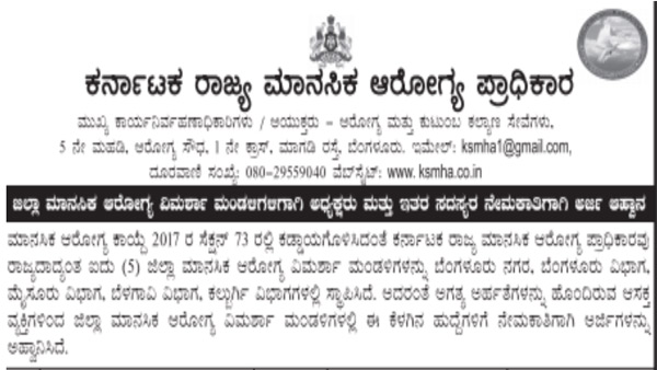 ಸಂಸ್ಥೆ ಹೆಸರು: Karnataka State Mental Health Authority (KSMHA Karnataka)