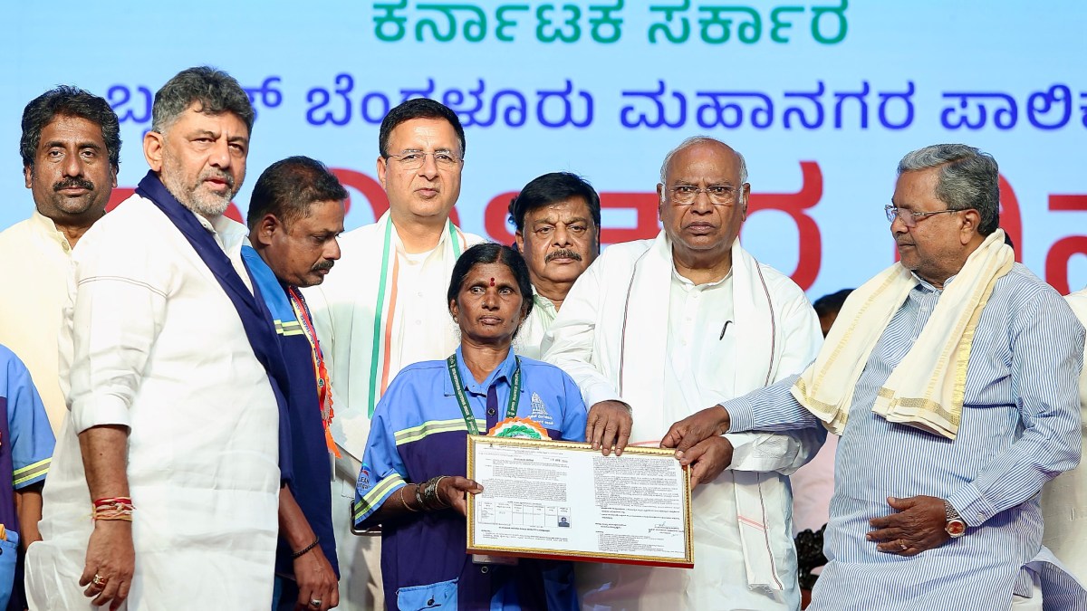 ಬೆಂಗಳೂರು, ಮೇ 01: ಬೆಂಗಳೂರಿನ ಅರಮನೆ ಮೈದಾನದಲ್ಲಿ ಗುರುವಾರ ಪೌರ- ಕಾರ್ಮಿಕರ ದಿನಾಚರಣೆ ಅಂಗವಾಗಿ ರಾಜ್ಯಸಭೆ ವಿರೋಧ ಪಕ್ಷದ ನಾಯಕ ಹಾಗೂ ಎಐಸಿಸಿ ಅಧ್ಯಕ್ಷರಾದ ಮಲ್ಲಿಕಾರ್ಜುನ ಖರ್ಗೆ, ಮುಖ್ಯಮಂತ್ರಿ ಸಿದ್ದರಾಮಯ್ಯ, ಡಿಸಿಎಂ ಡಿ.ಕೆ. ಶಿವಕುಮಾರ್ ಅವರು 12,692 ಮಂದಿ ಪೌರ ಕಾರ್ಮಿಕರಿಗೆ ಸೇವೆ ಖಾಯಂ ನೇಮಕಾತಿ ಪತ್ರ ವಿತರಣೆ ಮಾಡಿದರು.