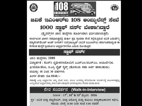 ಸಾರ್ವಜನಿಕ ಖಾಸಗಿ ಸಹಭಾಗಿತ್ವದಲ್ಲಿ ತುರ್ತು ಪ್ರತಿ ಸ್ಪಂದನಾ ಸೇವೆ ಸಲ್ಲಿಸುತ್ತಿರುವ ಜಿವಿಕೆ ಎಮರ್ಜೆನ್ಸಿ ಮ್ಯಾನೇಜ್ಮೆಂಟ್ ಅಂಡ್ ರೀಸರ್ಚ್ ಇನ್ಸಿಟಿಟ್ಯೂಟ್ (ಜಿವಿಕೆ ಇಎಂಆರ್ಐ) ಕರ್ನಾಟಕದಾದ್ಯಂತ ನೇರ ಸಂದರ್ಶನ ನಡೆಸುತ್ತಿದ್ದು, ಸ್ಟಾಫ್ನರ್ಸ್ ಹುದ್ದೆಗಳಿಗೆ ನೇಮಕಾತಿ ಮಾಡಿಕೊಳ್ಳುತ್ತಿದೆ.[ಆರ್ ಟಿಒ ನೇಮಕಾತಿ : ಅರ್ಜಿ ಹಾಕಲು ಮಾರ್ಚ್ 4 ಕೊನೆ ದಿನ]