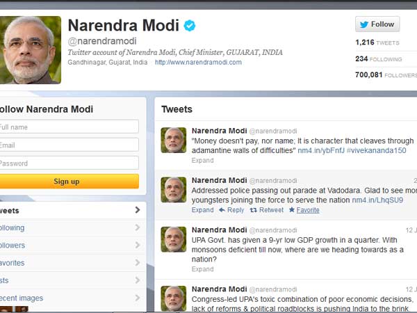 ಹಾಗೆ ನೋಡಿದರೆ ಸಾಮಾಜಿಕ ಜಾಲ ತಾಣದಲ್ಲಿ ತುಂಬಾ ಸಕ್ರಿಯರಾಗಿರುವ ರಾಜಕಾರಣಿ ಅಂದರೆ ಇವರೊಬ್ಬರೇ. 2011ರ ನವೆಂಬ್ 11ರಂದು ಮೋದಿ ಅವರ ಟ್ವಿಟ್ಟರ್ ಹಿಂಬಾಲಕರ ಸಂಖ್ಯೆ 4 ಲಕ್ಷಗಡಿ ದಾಟಿತ್ತು. ಅದು 5 ಲಕ್ಷ ಗಡಿ ದಾಟಿದ್ದು 2012ರ ಮಾರ್ಚ್ 3ರಂದು. ಈ ಮಧ್ಯೆ, ಮೋದಿ ಅವರ ಟ್ವಿಟ್ಟರ್ ಪುಟ ಸಮಗ್ರರ ಬದಲಾವಣೆಯೊಂದಿಗೆ ಹೊಸ ಹೊಳಪು ಪಡೆಯಿತು.