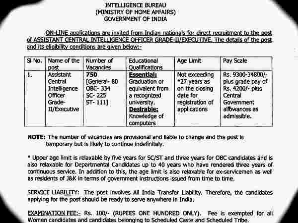 ಈಗಲೂ ಅಂತಹ ಅವಕಾಶವೊಂದು ನಿಮಗಾಗಿ ಕಾದಿದೆ. ತಡವೇಕೆ? ಅರ್ಜಿ ಗುಜರಾಯಿಸಿ. Intelligence Bureauಗೆ ಬೇಕಾಗಿದ್ದಾರೆ ಬರೋಬ್ಬರಿ 750 ಅಧಿಕಾರಿಗಳು. ಭಾರತ ಸರಕಾರದ ಗೃಹ ಸಚಿವಾಲಯದಡಿ ಬರುವ ಈ ಇಲಾಖೆಯು 750 ಮಂದಿ Associate Central Intelligence Officer (ACIO)ಗಳನ್ನು ನೇಮಕ ಮಾಡಿಕೊಳ್ಳಲಿದೆ.