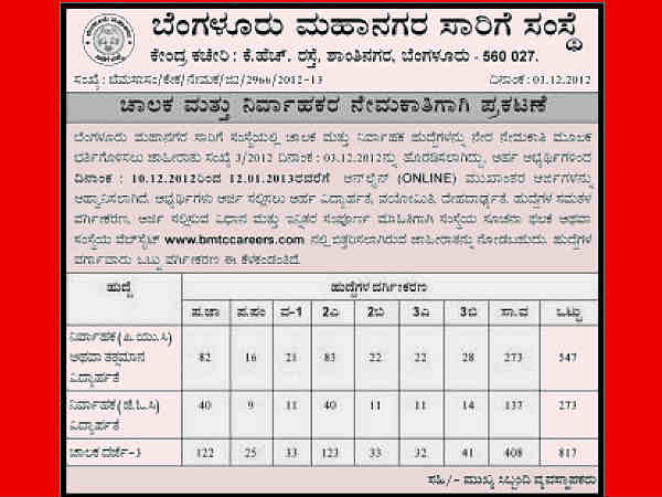 2012ರ ಡಿಸೆಂಬರ್ 10ರಿಂದ 2013ರ ಜನವರಿ 12 ರವರೆಗೆ ಅಂತರ್ಜಾಲದ ಮೂಲಕ ಅಭ್ಯರ್ಥಿಗಳು ಅರ್ಜಿ ಸಲ್ಲಿಸಬಹುದಾಗಿದೆ. ಅರ್ಹ ವಿದ್ಯಾರ್ಹತೆ, ವಯೋಮಿತಿ, ದೈಹಿಕ ಸಾಮರ್ಥ್ಯ, ಹುದ್ದೆಗಳ ವರ್ಗೀಕರಣ, ಅರ್ಜಿ ಸಲ್ಲಿಸುವ ವಿಧಾನ ಇನ್ನಿತರ ಸಂಪೂರ್ಣ ವಿವರಗಳನ್ನು www.bmtccareers.com ವಿಳಾಸದಲ್ಲಿ ನೀಡಲಾಗಿದೆ. ತಡವೇಕೆ, ಬಿಎಂಟಿಸಿ ಸಂಸ್ಥೆಯಲ್ಲಿ ಚಾಲಕ/ನಿರ್ವಾಹಕರಾಗುವ ಇಚ್ಛೆಯಿದ್ದಲ್ಲಿ apply ಮಾಡಿ, ನಮ್ಮ ಕಡೆಯಿಂದ All the Best ನಿಮಗಾಗಿ!