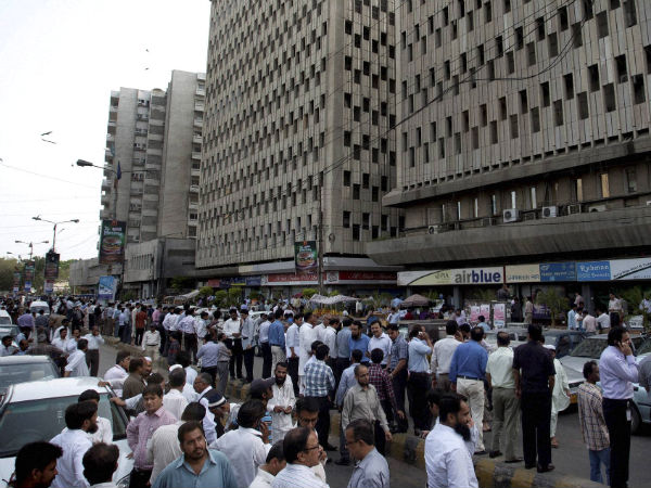 ಪಾಕಿಸ್ತಾನದ ಕರಾಚಿಯಲ್ಲಿ ಮಂಗಳವಾರ ಸಂಭವಿಸಿದ ಭೂಕಂಪದ ಪ್ರಕೋಪಕ್ಕೆ ಬೆದರಿ ಕಚೇರಿಯಿಂದ ಹೊರಬಿದ್ದ ಜನ. ಇರಾನ್ ನಲ್ಲಿ ನೂರಾರು ಜನರನ್ನು ಬಲಿ ತೆಗೆದುಕೊಂಡ ಭೂಕಂಪ ಐವತ್ತಕ್ಕೂ ಮನೆ, ಕಚೇರಿಗಳನ್ನು ಧ್ವಂಸಗೊಳಿಸಿದೆ