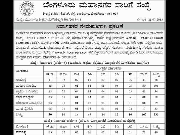 ಬೆಂಗಳೂರು ಮಹಾನಗರ ಸಾರಿಗೆ ಸಂಸ್ಥೆಯಲ್ಲಿ ನಿರ್ವಾಹಕ (ದರ್ಜೆ-3) ಹುದ್ದೆಗಳನ್ನು ನೇರನೇಮಕಾತಿ ಮೂಲಕ ಭರ್ತಿಗೊಳಿಸಲು ಜುಲೈ 25ರಂದು ಜಾಹೀರಾತು ನೀಡಲಾಗಿದೆ. ಅದರಂತೆ ಅರ್ಹ ಅಭ್ಯರ್ಥಿಗಳು ಜುಲೈ 27ರಿಂದ ಆಗಸ್ಟ್ 17 ರವರೆಗೆ ಆನ್ ಲೈನ್ (Online) ಮುಖಾಂತರ ಮಾತ್ರವೇ ಅರ್ಜಿಗಳನ್ನು ಸಲ್ಲಿಸಬೇಕು.