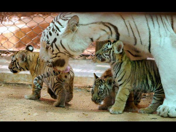 ಮೈಸೂರಿನ ಶ್ರೀಚಾಮರಾಜೇಂದ್ರ ಮೃಗಾಲಯದಲ್ಲಿ ಕಂಡ ಹೆಣ್ಣು ಹುಲಿ ಮಾನ್ಯ ತನ್ನ 2 ತಿಂಗಳ ಮರಿಗಳೊಂದಿಗೆ