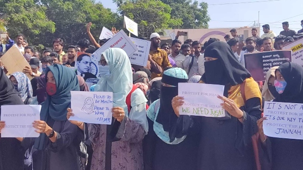 ನಗರದ ಪದವಿ ಪೂರ್ವ ಕಾಲೇಜಿನ ಎದುರಿನಲ್ಲಿ ಒಂದು ಗುಂಪಿನ ವಿದ್ಯಾರ್ಥಿಗಳು ಹಿಜಾಬ್ ಧರಿಸಿ ಪ್ರತಿಭಟನೆ ನಡೆಸುತ್ತಿದ್ದರೆ, ಇನ್ನೊಂದು ಕಡೆಯಲ್ಲಿ ಕೇಸರಿ ಶಾಲುಗಳನ್ನು ಹಾಕಿಕೊಂಡು ಬಂದು ಘೋಷಣೆಗಳನ್ನು ಕೂಗುತ್ತಿದ್ದಾರೆ.