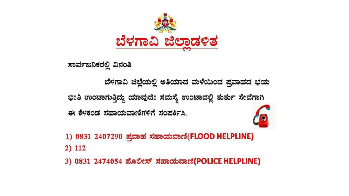 ಬೆಳಗಾವಿ ಜಿಲ್ಲೆಯಲ್ಲಿ ಭಾರೀ ಮಳೆಯಿಂದ ಪ್ರವಾಹದ ಭೀತಿ ಉಂಟಾಗಿದ್ದು, ಯಾವುದೇ ಸಮಸ್ಯೆ ಉಂಟಾದಲ್ಲಿ ತುರ್ತು ಸೇವೆಗಾಗಿ ಕೆಳಗಡೆ ನೀಡಿರುವ ಈ ಸಹಾಯವಾಣಿಗಳಿಗೆ ಸಂಪರ್ಕಿಸಬಹುದಾಗಿದೆ ಎಂದು ಜಿಲ್ಲಾಡಳಿತ ತಿಳಿಸಿದೆ.