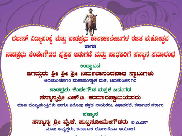 ಡಾ.ಸಿ.ಡಿ.ವೆಂಕಟೇಶ್ ಬರೆದಿರುವ ನಾಡಪ್ರಭು ಕೆಂಪೇಗೌಡ ಪುಸ್ತಕವನ್ನು ಇದೇ ಸಂದರ್ಭದಲ್ಲಿ ಪ್ರತಿಪಕ್ಷ ನಾಯಕ ಎಚ್.ಡಿ.ಕುಮಾರಸ್ವಾಮಿ ಬಿಡುಗಡೆ ಮಾಡಲಿದ್ದಾರೆ ಎಂದು ದರ್ಶನ್ ವಿದ್ಯಾಸಂಸ್ಥೆ ಹಾಗೂ ನಾಡಪ್ರಭು ಶಾಲಾ ಕಾಲೇಜುಗಳ ಕಾರ್ಯದರ್ಶಿ ಅ.ದೇವೇಗೌಡ ತಿಳಿಸಿದ್ದು, ಸರ್ವರಿಗೂ ಸ್ವಾಗತ ಕೋರಿದ್ದಾರೆ.