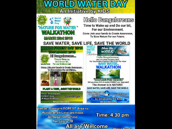 ನೀರಿನ ಸಂರಕ್ಷಣೆ ಕುರಿತಾಗಿ ಜಾಗೃತಿ ಮೂಡಿಸುವ ಕಾರ್ಯಕ್ರಮಗಳು ಎಲ್ಲೆಡೆ ನಡಡೆಯುತ್ತಿದೆ. ಇದೇ ರೀತಿ ಬೆಂಗಳೂರಿನಲ್ಲೂ ನೀರಿನ ಸಂರಕ್ಷಣೆ ಕುರಿತಾಗಿ ಮಾ.೨೩ರಂದು ಪುಟ್ಟೇನಹಳ್ಳಿ ಕೆರೆಯಿಂದ ಜೆಪಿನಗರ ಐದನೇ ಹಂತದವರೆಗೆ ವಾಕಥಾನ್ ನಡೆಯಲಿದೆ.