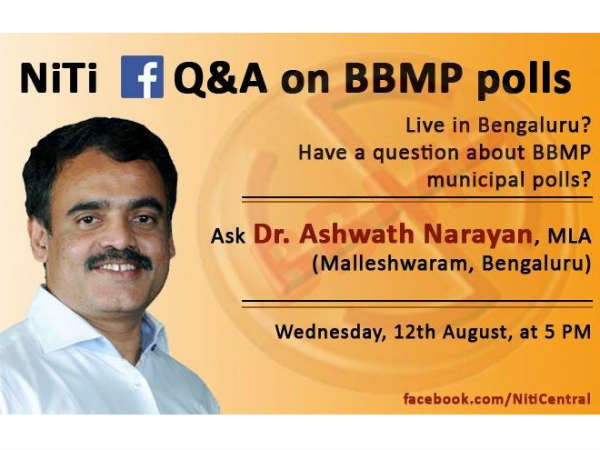 ಪ್ರಶ್ನೆಗಳಿದ್ದರೆ ಆಗಸ್ಟ್ 12, ಬುಧವಾರದಂದು ಸರಿಯಾಗಿ ಸಂಜೆ 5ಗಂಟೆಗೆ ಫೇಸ್ ಬುಕ್ಕಿಗೆ ಬನ್ನಿ. ಅಲ್ಲಿ ನಿಮಗಾಗಿ ಮಲ್ಲೇಶ್ವರದ ಶಾಸಕ ಡಾ. ಅಶ್ವತ್ಥ ನಾರಾಯಣ ಅವರು ನಿಮ್ಮ ಪ್ರಶ್ನೆಗಳಿಗೆ ಉತ್ತರ ನೀಡಲು ಕಾದಿರುತ್ತಾರೆ. ಅಶ್ವತ್ಥ ಅವರು ನಾಗರಿಕರೊಡನೆ ಫೇಸ್ ಬುಕ್ಕಿನಲ್ಲಿ ಲೈವ್ ಚಾಟ್ ಮಾಡಲಿದ್ದಾರೆ. [ಬಿಬಿಎಂಪಿ ಚುನಾವಣೆ ಕುರಿತ ಎಲ್ಲ ಲೇಖನಗಳು]