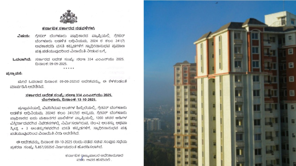 ಗ್ರೇಟರ್ ಬೆಂಗಳೂರು ಆಡಳಿತ ಅಧಿನಿಯಮ, 2024ರ ಕಲಂ 241(7)ರ ಅನ್ವಯ, ಗ್ರೇಟರ್ ಬೆಂಗಳೂರು ಪ್ರಾಧಿಕಾರದ ಐದು ಮಹಾನಗರ ಪಾಲಿಕೆಗಳ ವ್ಯಾಪ್ತಿಯಲ್ಲಿ, 1200 ಚದರ ಅಡಿಗಳ ವಿಸ್ತೀರ್ಣದವರೆಗಿನ ನಿವೇಶನಗಳಲ್ಲಿ ನಿರ್ಮಿಸಲಾಗಿರುವ, ನೆಲ+2 ಅಂತಸ್ತು ಅಥವಾ + 3 ಅಂತಸ್ತುಗಳವರೆಗಿನ ವಸತಿ ಕಟ್ಟಡಗಳಿಗೆ, ಸ್ವಾಧೀನಾನುಭವ ಪತ್ರ ಪಡೆಯುವುದರಿಂದ ವಿನಾಯಿತಿ ನೀಡಿ ಆದೇಶ ಮಾಡಿದೆ.