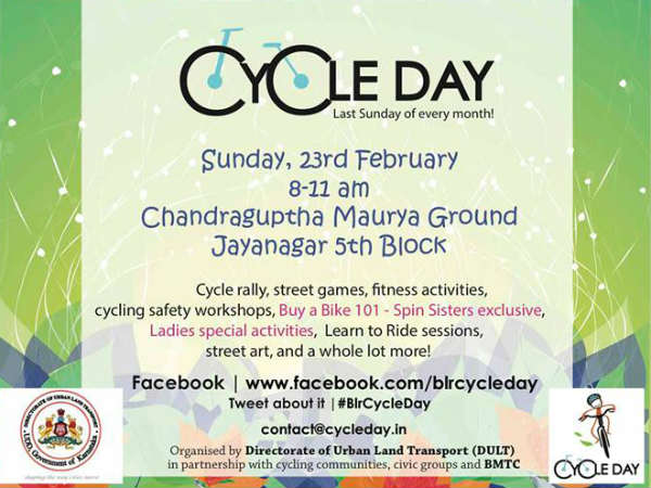 ಫೆ.23ರ ಭಾನುವಾರ ಜಯನಗರದ 5ನೇ ಬ್ಲಾಕ್ ನ ಶಾಲಿನಿ ಗ್ರೌಂಡ್ಸ್ ಬಳಿ ಬೆಳಗ್ಗೆ 7.30ಕ್ಕೆ ಫೀಲ್ ಬೆಂಗಳೂರು ಸೈಕಲ್ ಡೇ ಆರಂಭವಾಗಲಿದ್ದು, 6.5 ಕಿ.ಮೀಗಳ ವಿವಿಧ ಮಾರ್ಗಗಳ ಮೂಲಕ ಸಾಗಿ 9.45ಕ್ಕೆ ಪುನಃ ಶಾಲಿನಿ ಗ್ರೌಂಡ್ಸ್ ಬಳಿ ಮುಕ್ತಾಯವಾಗಲಿದೆ. [ಹೆಚ್ಚಿನ ಮಾಹಿತಿಗಾಗಿ ಕ್ಲಿಕ್ ಮಾಡಿ]