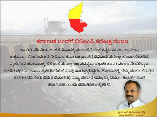 'ಆಡಳಿತ ಪಕ್ಷವಾದ ಕಾರಣ ನಾವು ಪಾಲ್ಗೊಳ್ಳದಿದ್ದರೂ ಹೋರಾಟಕ್ಕೆ ನಮ್ಮ ಬೆಂಬಲವಿರುತ್ತದೆ. ಕಾವೇರಿ ನದಿ ನೀರು ಹರಿಸುವ ವಿಚಾರದಲ್ಲಿ ರಾಜ್ಯ ಸರ್ಕಾರ ಮತ್ತೊಮ್ಮೆ ಸುಪ್ರೀಂಕೋರ್ಟ್ ಮೊರೆ ಹೋಗಬೇಕು ಎಂದು ವಿನಂತಿ ಮಾಡಿಕೊಳ್ಳುತ್ತೇನೆ' ಎಂದು ಮೇಯರ್ ತಿಳಿಸಿದ್ದಾರೆ.[ಸೆ.9ರ ಕರ್ನಾಟಕ ಬಂದ್ ಬಿಸಿ ಎಲ್ಲಿಗೆ ತಟ್ಟಲಿದೆ?]