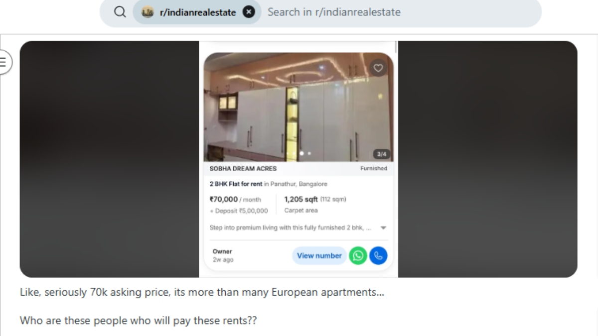 ಇಂತಹ ದುಬಾರಿ ಮನೆ ಬಾಡಿಗೆಗೆ ಇರುವುದು ಬೆಂಗಳೂರಿನ ಪಣತ್ತೂರು ಪ್ರದೇಶದಲ್ಲಿ. ಹೌದು, ಇಲ್ಲಿ 2BHK ಮನೆಯೊಂದಿಗೆ ಈ ಪಾಟಿ ದುಬಾರಿ ಬಾಡಿಗೆ ಹೇಳಿದ್ದನ್ನು ಕೇಳಿ ತಬ್ಬಿಬ್ಬುಗೊಂಡವರು ರೆಡ್ಡಿಟ್ನಲ್ಲಿ r/Indianrealestate ಖಾತೆಯಿಂದ ಪೋಸ್ಟ್ ಹಂಚಿಕೊಂಡಿದ್ದಾರೆ. 'ಸದ್ಯ ಈ ಮನೆಗೆ ಕೇಳಿರುವ 70 ಸಾವಿರ ರೂಪಾಯಿ ಅನೇಕ ಯುರೋಪಿಯನ್ ಅಪಾರ್ಟ್ಮೆಂಟ್ಗಳಿಗಿಂತ ಅಧಿಕವಾಗಿದೆ' ಎಂದು ಬರೆದುಕೊಂಡಿದ್ದಾರೆ.