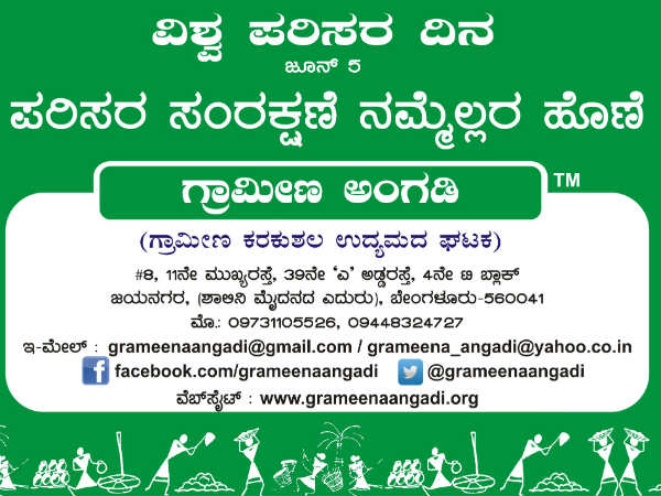 ಬೆಂಗಳೂರು, ಜೂ,. 03: ಜೂನ್ 5 ರ ವಿಶ್ವ ಪರಿಸರ ದಿನಾಚರಣೆಯ ಅಂಗವಾಗಿ 'ಗ್ರಾಮೀಣ ಅಂಗಡಿ ಪರಿಸರ ಜಾಗೃತಿ ಕಾರ್ಯಕ್ರಮ ಹಮ್ಮಿಕೊಂಡಿದೆ. "ಪರಿಸರ ಸಂರಕ್ಷಣೆ ನಮ್ಮೆಲ್ಲರ ಹೊಣೆ" ಎಂಬ ಘೋಷಣೆಯನ್ನು ಹಳೆಯ ನ್ಯೂಸ್ ಪೇಪರ್ ಬ್ಯಾಗ್ಗಳ ಮೇಲೆ ಮುದ್ರಿಸಿ ಸಾರ್ವಜನಿಕರಿಗೆ ವಿತರಿಸುವ ಪ್ರಚಾರಾಂದೋಲನ ನಡೆಸಲಿದೆ.