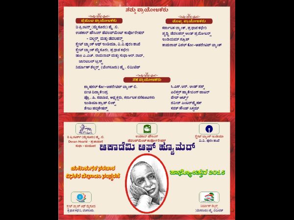 ಬೇಲೂರು ರಾಮಮೂರ್ತಿ ಮತ್ತು ವೈ ವಿ ಗುಂಡೂರಾವ್ ನೇತೃತ್ವದಲ್ಲಿ ಕಾರ್ಯಕ್ರಮ ನಡೆಯಲಿದ್ದು ಹಿರಿಯ ಹಾಸ್ಯ ಲೇಖಕ ಬಿ ಎಸ್ ಕೇಶವರಾವ್ ಅವರಿಗೆ ಅಭಿನಂದನೆ ನಡೆಯಲಿದೆ. ಮುಖ್ಯ ಅತಿಥಿಗಳಾಗಿ ನ್ಯಾಷನಲ್ ಎಜುಕೇಶನ್ ಟ್ರಸ್ಟ್ ಅಧ್ಯಕ್ಷ ಡಾ. ಎ ಎಚ್ ರಾಮರಾವ್ ಮತ್ತು ಕನ್ನಡ ಮತ್ತು ಸಂಸ್ಕೃತಿ ಇಲಾಖೆ ವಿಶ್ರಾಂತ ನಿರ್ದೇಶಕ ಮನು ಬಳಿಗಾರ್ ಭಾಗವಹಿಸಲಿದ್ದಾರೆ.