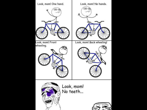 ಏನಿದೆ ರೇಖಾಚಿತ್ರದಲ್ಲಿ? : ಓರ್ವ ಯುವಕ ಸೈಕಲ್ನಲ್ಲಿ ವ್ಹೀಲಿಂಗ್ ಮಾಡುತ್ತಿರುತ್ತಾನೆ. ಕೈಬಿಟ್ಟು ಚಲಾಯಿಸುವುದು, ಫ್ರಂಟ್ ವ್ಹೀಲಿಂಗ್, ಬ್ಯಾಕ್ ವ್ಹೀಲಿಂಗ್ ಮಾಡುತ್ತ ತಾಯಿಗೆ ಹೆಮ್ಮೆಯಿಂದ ತೋರಿಸುತ್ತಾನೆ. ಕೊನೆಯಲ್ಲಿ ತನ್ನ ಹಲ್ಲು ಮುರಿದುಹೋಗಿದೆ ಎಂದು ನೋವಿನಿಂದ ಹೇಳಿಕೊಳ್ಳುತ್ತಾನೆ.