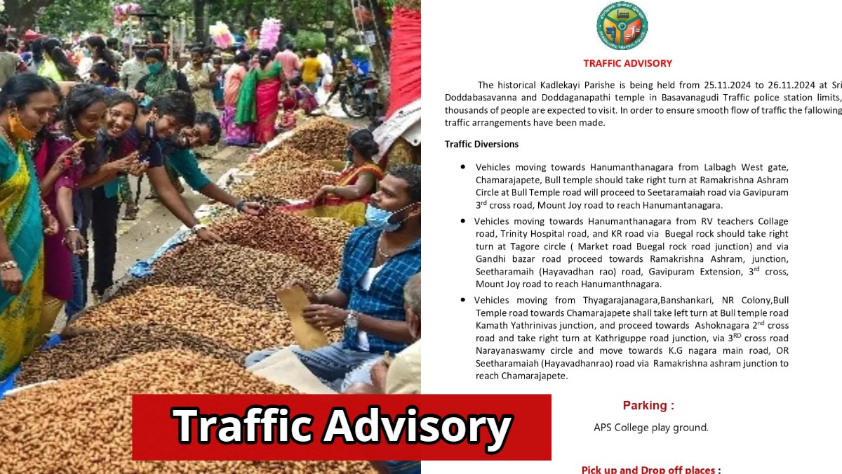 ಬಸವನಗುಡಿ ಸಂಚಾರ ಪೊಲೀಸ್ ಠಾಣೆ ಸರಹದ್ದಿನ ಶ್ರೀ ದೊಡ್ಡಬಸವಣ್ಣ ಮತ್ತು ದೊಡ್ಡ ಗಣಪತಿ ದೇವಸ್ಥಾನದಲ್ಲಿ ಸಂಪ್ರದಾಯದಂತೆ ಐತಿಹಾಸಿಕ ಕಡೆಲೆಕಾಯಿ ಪರಿಷೆ ಲಕ್ಷಾಂತರ ಜನರು ಸೇರಲಿದ್ದಾರೆ. ಈ ಕಾರಣದಿಂದ ವಾಹನಗಳ ಸುಗಮ ಸಂಚಾರದ ಅಡ್ಡಿ ಆಗದಂತೆ ಕ್ರಮ ವಹಿಸಲಾಗಿದೆ. ಸವಾರರು ಮತ್ತು ಸಾರ್ವಜನಿಕರ ಹಿತದೃಷ್ಟಿಯಿಂದ ಬುಲ್ ಟೆಂಪಲ್ ರಸ್ತೆಯಲ್ಲಿ ಈ ಕೆಳಕಂಡಂತೆ ಸಂಚಾರ ಮಾರ್ಪಾಟು ಮಾಡಲಾಗಿದೆ.