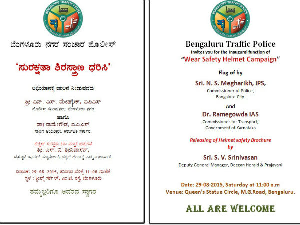 ಹೆಲ್ಮೆಟ್ ಧರಿಸುವುದರಿಂದ ಆಗುವ ಅನುಕೂಲದ ಕುರಿತಾಗಿ ನಡೆಯುವ ಈ ಅಭಿಯಾನ ಆಗಸ್ಟ್ 29ರ ಶನಿವಾರ ಬೆಳಿಗ್ಗೆ, 11 ಗಂಟೆಗೆ ಎಂ.ಜಿ ರಸ್ತೆಯ ಕ್ವೀನ್ಸ್ ಸರ್ಕಲ್ನಲ್ಲಿ ಪ್ರಾರಂಭಗೊಳ್ಳಲಿದೆ.
