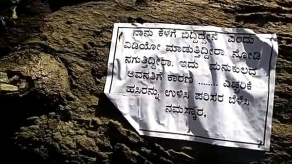 ವಿಜಯನಗರದಲ್ಲಿ ಉರುಳಿಬಿದ್ದ ಮರವೊಂದು 'ನಾನು ಕೆಳಗೆ ಬಿದ್ದೆನೆಂದು ವಿಡಿಯೋ ಮಾಡುತ್ತಿದ್ದೀರಾ? ನೋದಿ ನಗುತ್ತಿದ್ದೀರಾ? ಇದು ಮನುಕುಲದ ಅವನತಿಗೆ ಕಾರಣ... ಎಚ್ಚರಿಕೆ ಹಸಿರನ್ನು ಉಳಿಸಿ, ಪರಿಸರ ಬೆಳೆಸಿ. ನಮಸ್ಕಾರ' ಎಂದು ಕೆಳಗೆ ಬಿದ್ದ ಮರ ಹೇಳುತ್ತಿದೆ.