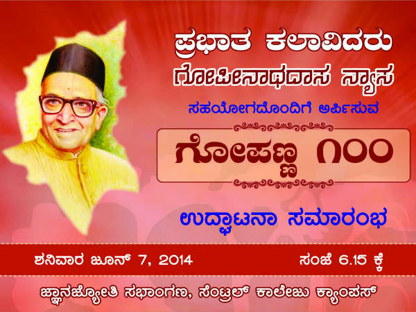 ಬೆಂಗಳೂರು, ಜೂ. 7 : ಎಂಬತ್ಮೂರು ವರ್ಷಗಳ ಭವ್ಯ ಇತಿಹಾಸವಿರುವ ಕನ್ನಡ ನಾಡಿನ ಹೆಮ್ಮೆಯ ನೃತ್ಯ ನಾಟಕ ಪರಿವಾರ 'ಪ್ರಭಾತ್ ಕಲಾವಿದರು' ಸಂಸ್ಥೆಯನ್ನು ಸ್ಥಾಪಿಸಿದ 'ಹರಿಕಥಾ ರತ್ನ' ಟಿ.ವಿ. ಗೋಪಿನಾಥ ದಾಸರು ಅವರ ಜನ್ಮ ಶತಮಾನೋತ್ಸವ 'ಗೋಪಣ್ಣ 100' ಜೂ.7ರಿಂದ ಎಂಟು ದಿನಗಳ ಕಾಲ ಭವ್ಯವಾಗಿ ಬೆಂಗಳೂರಿನಲ್ಲಿ ಆಚರಿಸಲಾಗುತ್ತಿದೆ.