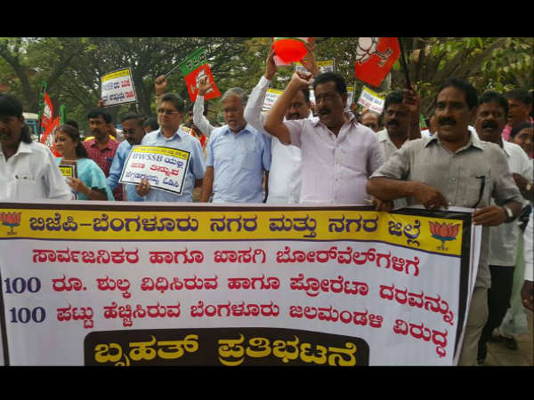 ಜಲಮಂಡಳಿ ಕಚೇರಿ ಮುಂದೆ ಗುರುವಾರ ಬಿಜೆಪಿ ನಾಯಕರು ಪ್ರತಿಭಟನೆ ನಡೆಸಿದರು. ಜಲಮಂಡಳಿಯ ವಿವೇಚನಾರಹಿತ ನಿರ್ಧಾರವನ್ನು ತಕ್ಷಣ ವಾಪಸ್ ಪಡೆಯಬೇಕು ಎಂದು ಆಗ್ರಹಿಸಿದರು. ಸುಮಾರು ಎರಡು ಗಂಟೆಗಳ ಕಾಲ ಪ್ರತಿಭಟನೆ ನಡೆಸಿದ ನಾಯಕರನ್ನು ವಶಕ್ಕೆ ಪಡೆದ ಪೊಲೀಸರು ನಂತರ ಅವರನ್ನು ಬಿಡುಗಡೆ ಮಾಡಿದರು. [ಪ್ರೋರೇಟಾ ಶುಲ್ಕ ಹೆಚ್ಚಿಸಿದ ಬೆಂಗಳೂರು ಜಲಮಂಡಳಿ]