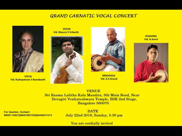 ಬೆಂಗಳೂರು, ಜು.18: ಕರ್ನಾಟಕ ಶಾಸ್ತ್ರೀಯ ಸಂಗೀತ ಪ್ರಿಯರಿಗಾಗಿ ಕರ್ನಾಟಕ ಶಾಸ್ತ್ರೀಯ ಸಂಗೀತ ಕಾರ್ಯಕ್ರಮವು ಜು.22ರಂದು ಶ್ರೀರಾಮ ಲಲಿತಕಲಾ ಮಂದಿರದಲ್ಲಿ ನಡೆಯಲಿದೆ.