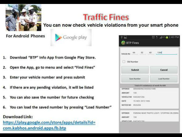 ಹೀಗೆ ಸಿಕ್ಕಿಬಿದ್ದವರು ನಂತರ ತಮ್ಮ ಪ್ರಕರಣದ ವಿವರ ತಿಳಿಯದೇ ಪರದಾಡುತ್ತಾರೆ. ವಿವರಕ್ಕಾಗಿ ಪೊಲೀಸ್ ಠಾಣೆ ಅಲೆಯಬೇಕಾಗುತ್ತದೆ. ಆದ್ದರಿಂದ ಬೆಂಗಳೂರು ನಗರ ಪೊಲೀಸ್ ಸ್ಮಾರ್ಟ್ ಫೋನ್ ಬಳಕೆದಾರರಿಗಾಗಿ ಆಪ್ ಬಿಡುಗಡೆ ಮಾಡಿದೆ. [ಮೊಬೈಲ್ ಒನ್ ಸೇವೆ ಪಡೆಯುವುದು ಹೇಗೆ?]