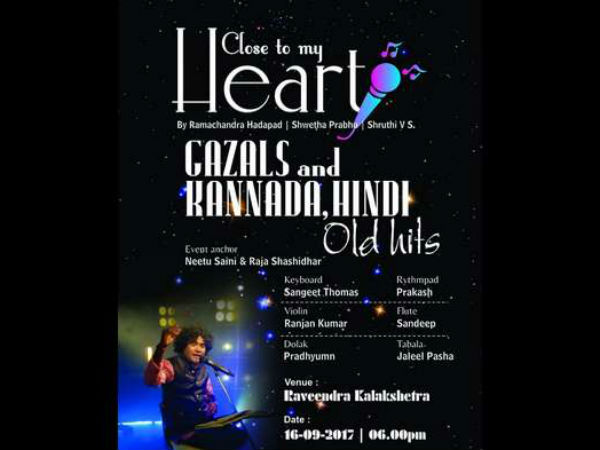 ಬೆಂಗಳೂರಿನ ರವೀಂದ್ರ ಕಲಾಕ್ಷೇತ್ರದಲ್ಲಿ ಸೆ. 16 ರಂದು ಸಂಜೆ 6 ಕ್ಕೆ ಕಾರ್ಯಕ್ರಮ ನಡೆಯಲಿದ್ದು, ಪ್ರಸಿದ್ಧ ಗಾಯಕರೂ, ಸಂಗೀತಗಾರರೂ ಆದ ರಾಮಚಂದ್ರ ಹಡಪದ, ಶ್ವೇತಾ ಪ್ರಭು, ಶ್ರುತಿ ವಿ.ಎಸ್. 'ಕ್ಲೋಸ್ ಟು ಮೈ ಹಾರ್ಟ್' ಎಂಬ ಈ ಕಾರ್ಯಕ್ರಮದಲ್ಲಿ ಸಂಗೀತ ಪ್ರೇಮಿಗಳಿಗೆ ಗಾನ ರಸದೌತಣ ಉಣಬಡಿಸಲಿದ್ದಾರೆ.