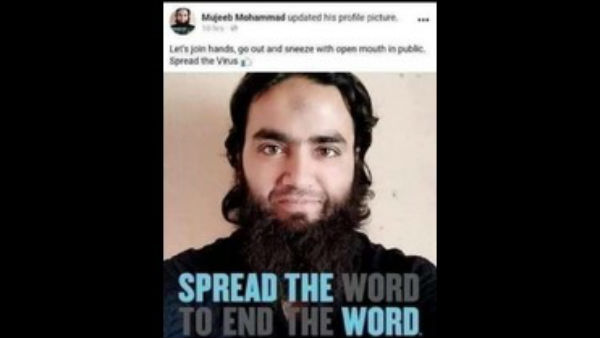 ನಿಮ್ಮ ಮನೆಯಿಂದ ಹೊರ ಬಂದು ಉಗುಳಿ, ಕೆಮ್ಮಿ, ಈ ಮೂಲಕ ಕೊರೊನಾವೈರಸ್ ಹರಡುವಂತೆ ಮಾಡಲು ಸಹಕರಿಸಿ ಎಂಬುದಾಗಿ ಫೇಸ್ ಬುಕ್ ನಲ್ಲಿ ಪೋಸ್ಟ್ ಮಾಡಿದ್ದ ಈಗ ಪೊಲೀಸರ ಬಂಧನದಲ್ಲಿದ್ದು, ಐಪಿಸಿ ಸೆಕ್ಷನ್ 505 ಅನ್ವಯ ಪ್ರಕರಣ ಎದುರಿಸುತ್ತಿದ್ದಾನೆ. ಈ ರೀತಿ ಪೋಸ್ಟ್ ಹಾಕಲು ಏನು ಕಾರಣ ಎಂಬುದು ಇನ್ನೂ ತಿಳಿದು ಬಂದಿಲ್ಲ. ಸದ್ಯ ವಿಚಾರಣೆ ಜಾರಿಯಲ್ಲಿದೆ.