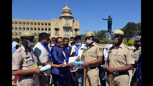 ಕರ್ನಾಟಕ ದಲಿತ ಸಂಘರ್ಷ ಸಮಿತಿಯ ರಾಜ್ಯಾಧ್ಯಕ್ಷರಾದ ಡಾ.ಸಿ.ಎಸ್ ರಘು ಅವರ ನೇತೃತ್ವದಲ್ಲಿ ಆಯೋಜಿಸಲಾಗಿದ್ದ ಈ ಕಾರ್ಯಕ್ರಮದಲ್ಲಿ ಪೊಲೀಸರು ಹಾಗೂ ಸಾರ್ವಜನಿಕರಿಗೆ ವಿತರಣೆಯನ್ನು ಮಾಡಲಾಯಿತು. ನಂತರ ಮಾತನಾಡಿದ ಅವರು ಸಂವಿಧಾನದ ಮೂಲ ಆಶಯಗಳನ್ನು ನಾವು ಮರೆಯುತ್ತಿದ್ದೇವೆ ಎನ್ನಿಸುತ್ತಿದೆ. ಈ ನಿಟ್ಟಿನಲ್ಲಿ ಜನರಲ್ಲಿ ಡಾ.ಬಿ.ಆರ್ ಅಂಬೇಡ್ಕರ್ ಅವರ ಸಂವಿಧಾನದ ಪ್ರತಿಗಳನ್ನು ನೀಡುವ ಉದ್ದೇಶದಿಂದ ನಾವು ಸಂವಿಧಾನದ ಪೀಠಿಕೆಯ ಪ್ರತಿಗಳು ಹಾಗೂ ಸ್ಯಾನಿಟೈಸರ್ ಮತ್ತು ಮಾಸ್ಕ್ಗಳನ್ನು ವಿತರಿಸಿದ್ದೇವೆ. ಸಂವಿಧಾನ ಸಂರಕ್ಷಿಸಿ ಪ್ರಜಾಪ್ರಭುತ್ವ ಉಳಿಸಿ ಎನ್ನುವ ಜನಜಾಗೃತಿಯ ಅಭಿಯಾನವನ್ನು ಹಮ್ಮಿಕೊಂಡಿದ್ದೇವೆ ಎಂದು ಹೇಳಿದರು.
